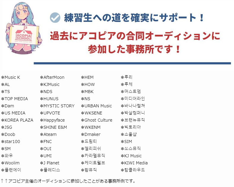 ※このサポートは、どなたでも利用できます。アコピアのオーディションだけでなく、日本と韓国のあらゆるオーディションで韓国の事務所の審査に合格した場合に御利用できます。空港からオーディション会場への同行、練習生契約の交渉とアドバイスまで、アコピアは皆さまの夢を誠心誠意で応援させて頂きます!