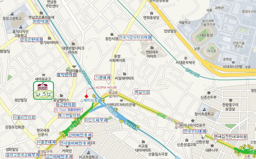 ↑上をクリックしたら地図が開きます。アコピアハウスより徒歩2分のところに年中無休の薬局があります。毎日11:00~23:00営業です。延南薬局(ヨンナムヤッキョク) TEL (02) 336-1533