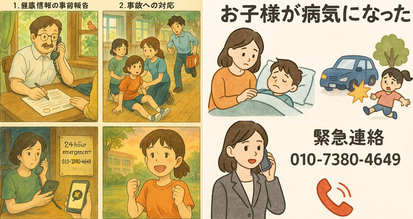 弊社にご連絡ください。緊急の場合、弊社の日本人インターンスタッフが近所の病院へ同行いたします。