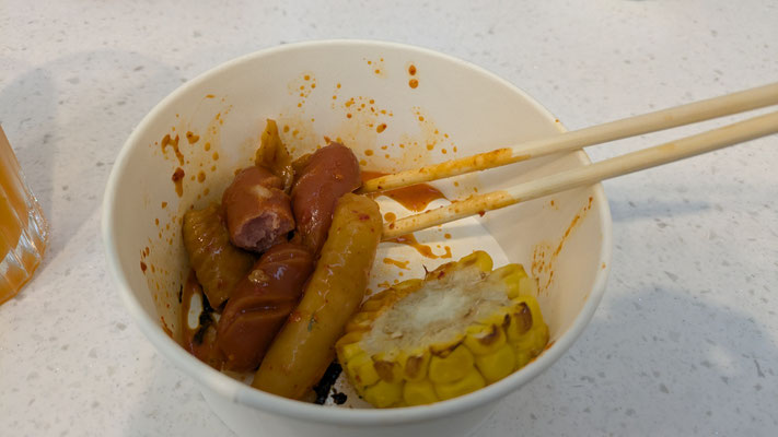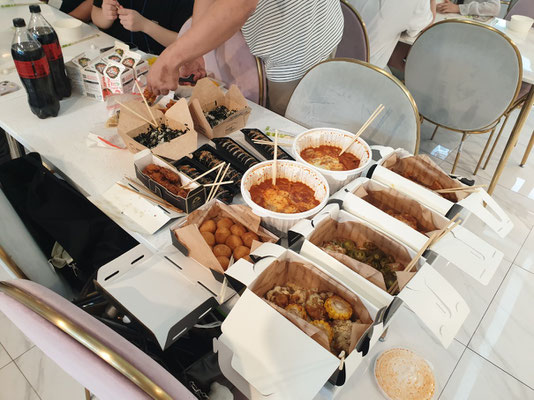 昼食の時間には、チキンやキンパが用意されていました。チキンは衣がカリッとしていて中はジューシー、甘辛いソースがしっかり絡んでいて、まさに韓国ならではの味わいでした。キンパは色とりどりの具材がぎっしりと詰まり、ひと口食べるごとに海苔の香りとごま油の風味が広がります。食卓を囲みながら、食文化の違いについて話し合ったり、好きな食べ物を紹介し合ったりするうちに、距離が一気に縮まりました。