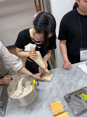 私はトッピングをするグループにいたのですが、スポンジが焼けるのを待っていたので最初はすることがあまりありませんでした。ですが、そのおかげでまだあまり話せていなかった生徒の方と話すことができ距離を縮めることができました。どうして留学をしたのか、どうしてこの学校に入学したのか、などお互いのことについて質問しあったり、お互いのすきなアイドルグループの話をしたりしました。韓国の人はk-popアイドルに興味がないと聞いたことがあるので、好きなアイドルがいるか聞いてもわからないのかなと思い、私からは聞かなかったのですが向こうから聞いてくれてとても嬉しかったです。